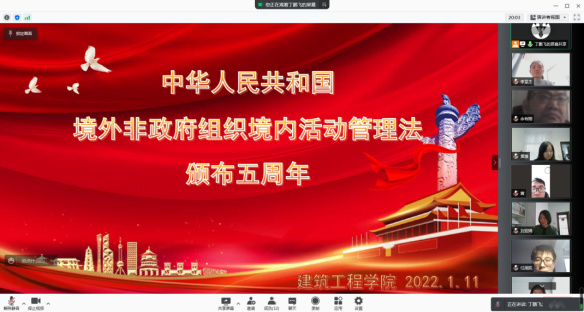 为了增强师生法律意识和国家安全意识,按照河南省教育厅《关于组织开展<境外非政府组织境内活动管理法>实施五周年普法宣传周活动的通知》和学校有关工作要求,2022年1月11日,建筑工程学院党总支利用线上腾讯会议的形式组织全体教职工学习了《境外非政府组织境内活动管理法》,会议由学院党总支书记马春燕主持。