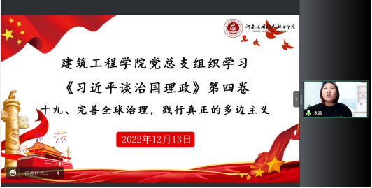 2022年12月13日下午,建筑工程学院党总支通过腾讯会议组织开展线上政治理论学习活动,集中学习了《求是》2022年第23期习近平总书记重要文章《在党的十九届七中全会第二次全体会议上的讲话》《习近平谈治国理政》第四卷、《全面从严治党向基层延伸》《习近平生态文文明思想学习纲要》《习近平经济思想学习纲要》等部分内容。会议由建筑工程学院党总支书记马春燕主持,院长张虎及全体教职工参加会议。
