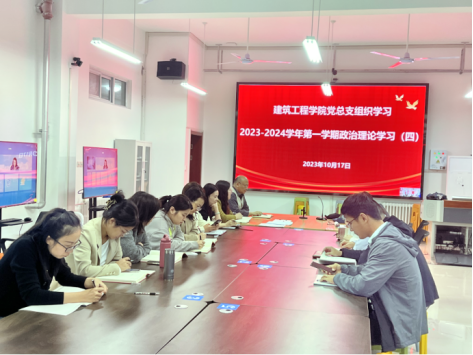 2023年10月17日下午,建筑工程学院党总支在郑州校区办公楼516党员活动室(开封校区C104)组织开展政治理论学习活动。本次学习采取东西校区视频连线,线上、线下相结合的方式,会议由建筑工程学院党总支书记马春燕主持,院长张虎及全体教职工参加。