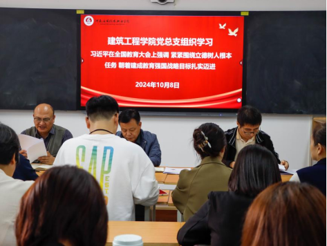 2024年10月8日下午,建筑工程学院党总支在开封校区北院F106教室组织开展政治理论学习活动。会议由建筑工程学院党总支书记张虎主持,院长李勇及全体教职工参加。