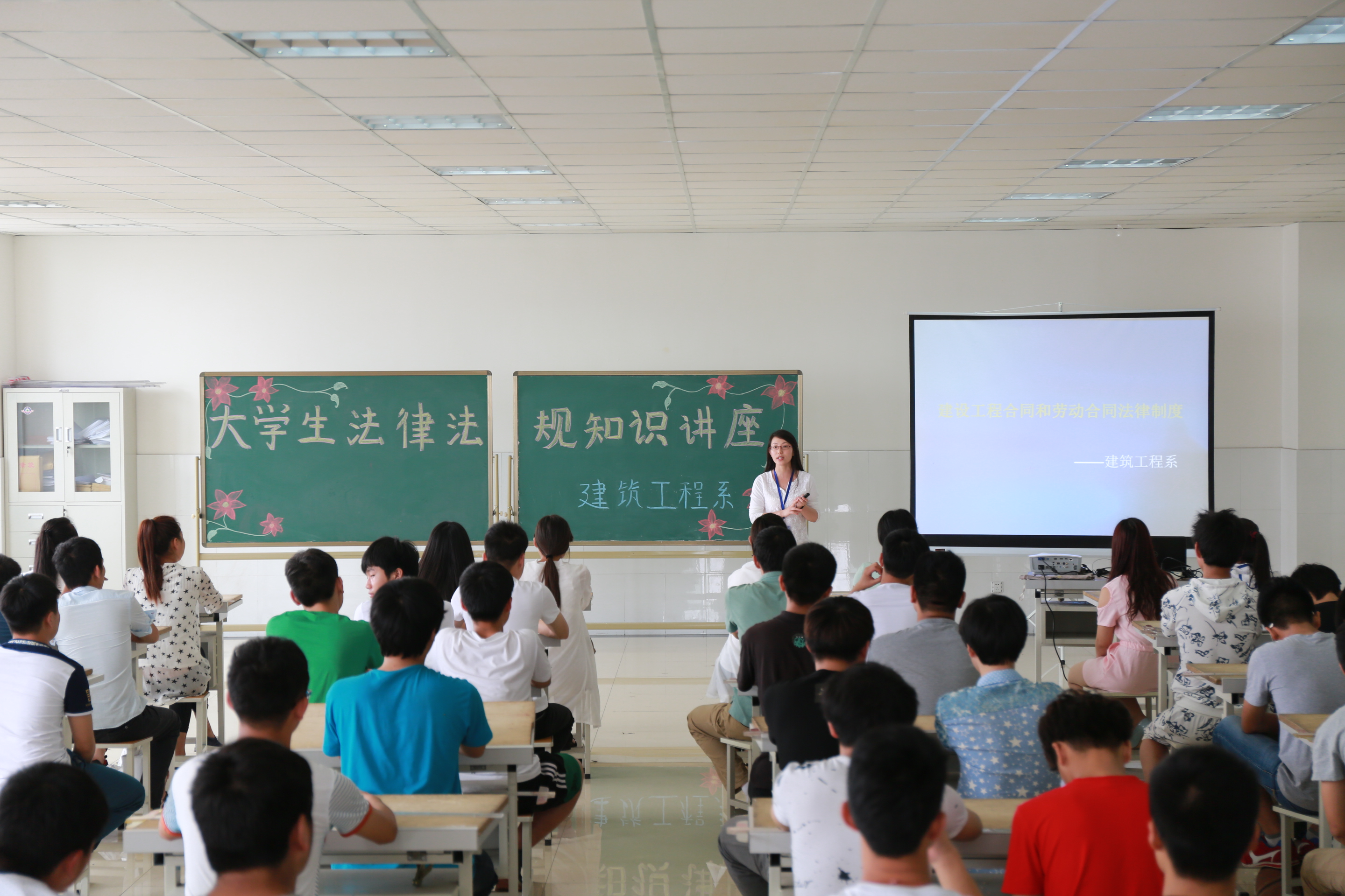 为提高建筑工程系学生的法律意识,增强同学们的法律观念,维护同学们的合法权益,创建和谐校园,我系于2015年5月29日,以知法、懂法、学法、用法为主题,举办了“第一届大学生法律法规知识讲座”,旨在让同学们了解法律常识,普及法律常识,将法律知识运用到社会工作中去。本次专题讲座在E613教室成功举行,主讲内容为《建设工程合同和劳动合同法律制度》,讲座中,刘亚娟老师根据学生所学专业,针对毕业以后将面临的就业合同、劳务合同、劳动纠纷解决途径等相关法律知识向同学们进行了详细的解答。整个环节中,同学们积极提问,老师风趣解答,给同学们留下了深刻印象。