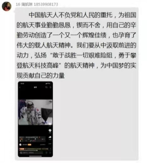 通过观看直播,我院学子一睹我国英雄精神风貌,更坚定了作为年轻一代的目标,要勇于发扬传承精神,崇尚科学,为祖国骄傲!让我们一起为航天员加油,期待英雄们凯旋归来。