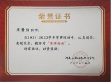 2023年05月,获得河南应用技术职业学院2023年度军训标兵