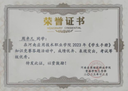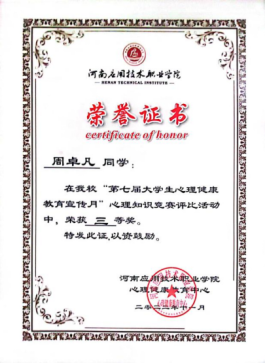 2022年11月荣获河南应用技术职业学院心理知识竞赛三等奖