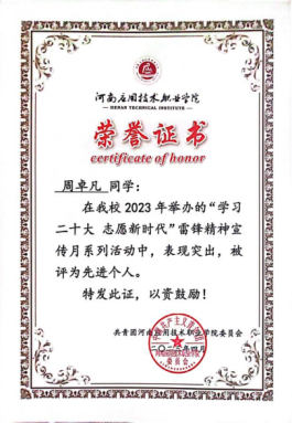 2022年4月荣获河南应用技术职业学院“学习二十大 志愿新时代”雷锋精神宣传月系列活动中先进个人