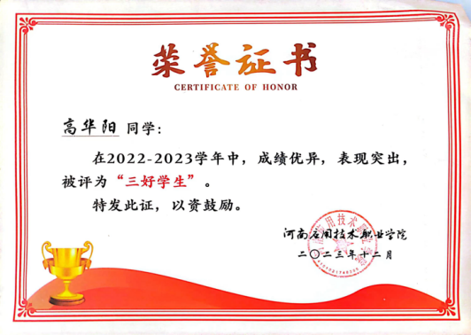 高华阳,男,汉族,中共预备党员,河南应用技术职业学院建筑工程学院2022级工程造价1班。在校期间担任纪检部干事,曾荣获河南应用技术职业学院“三好学生”、“军训标兵”、“优秀志愿者”、河南省第十六届“挑战杯”二等奖。